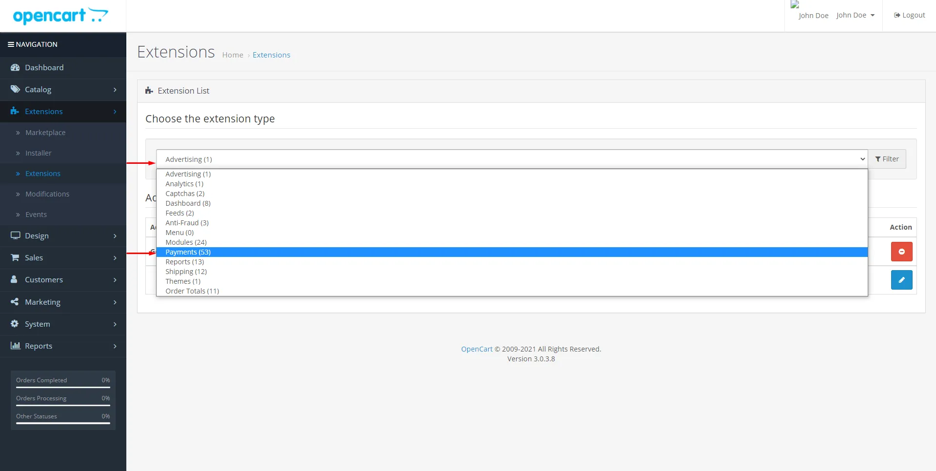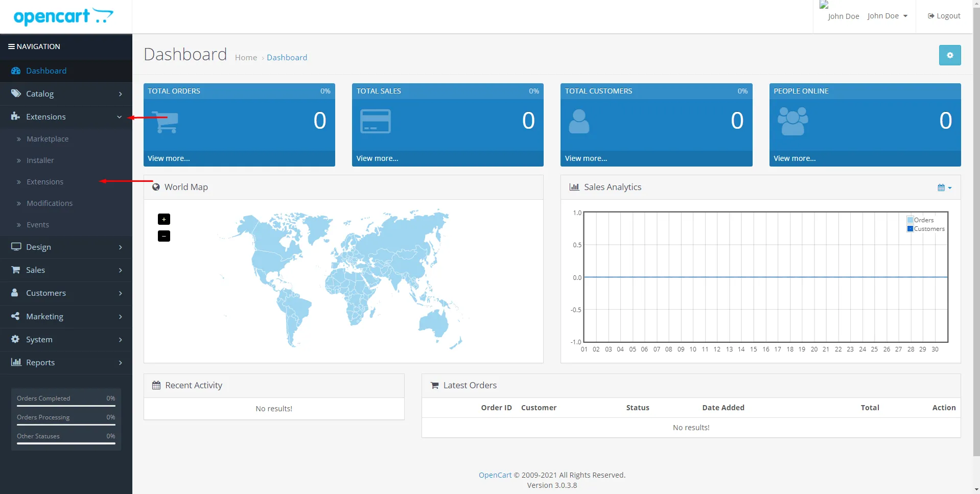 - Artık Pay N Kolay Eklentisi Opencart'a kuruldu. Admin panelinde Sol Menüden Extensions > Extensions kısmına tıklayınız.