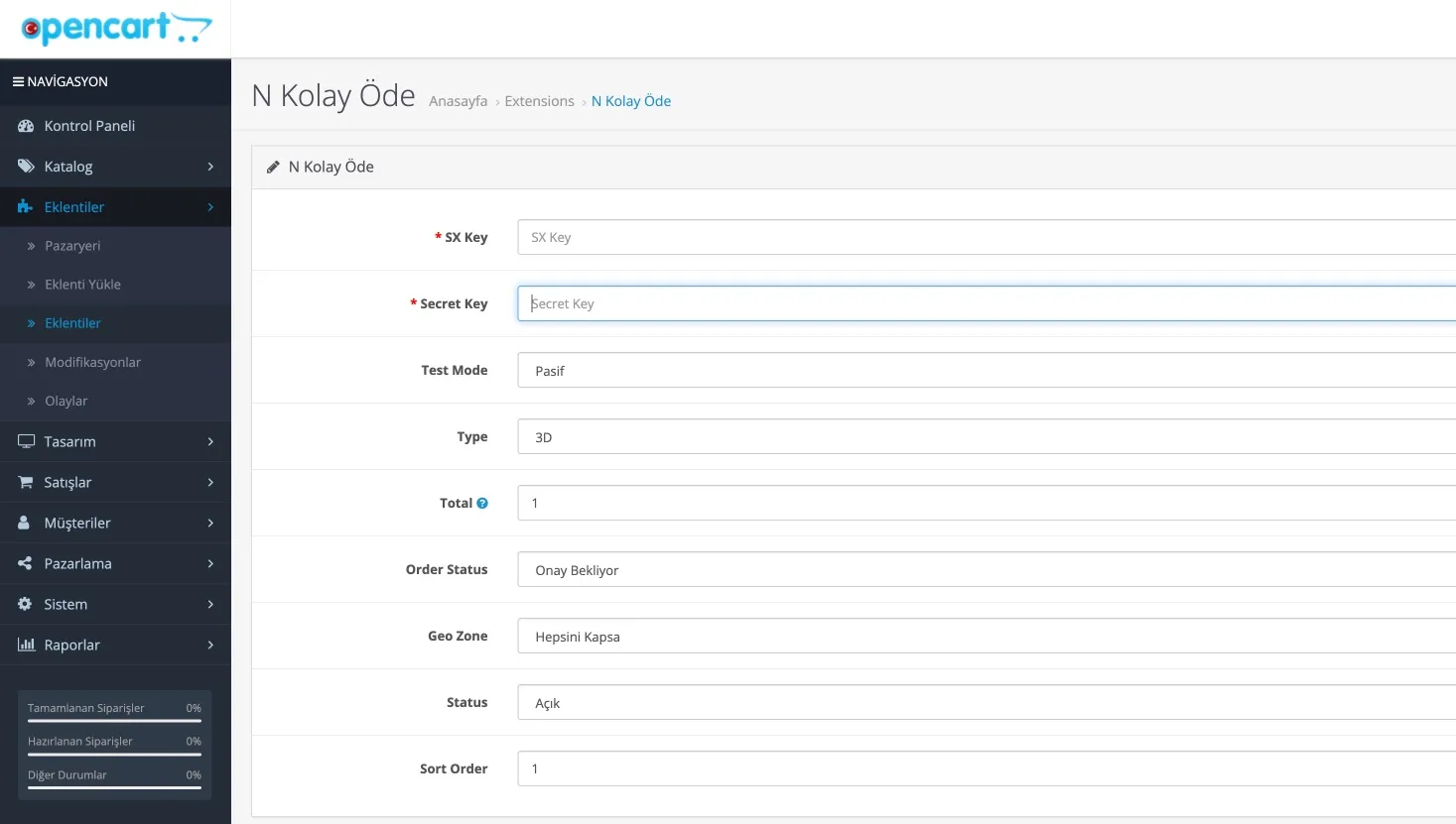 - Açılan pencerede SX Key, Secret Key bilgilerinizi girip Plugin Status kısmından Activated'ı seçip kaydediniz. Böylelikle N Kolay SanalPos modülünü sitenize entegre etmiş olursunuz.