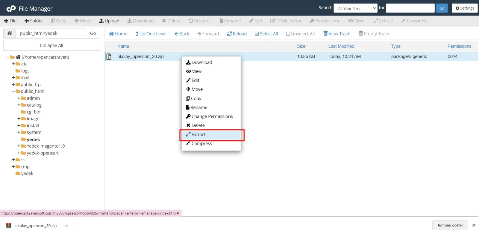 - Dosyayı yükledikten sonra üzerine sağ tıklayıp Extract'a tıklayınız.