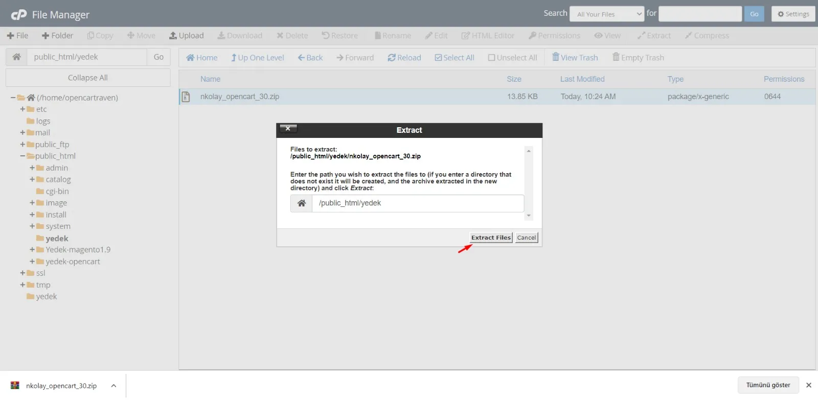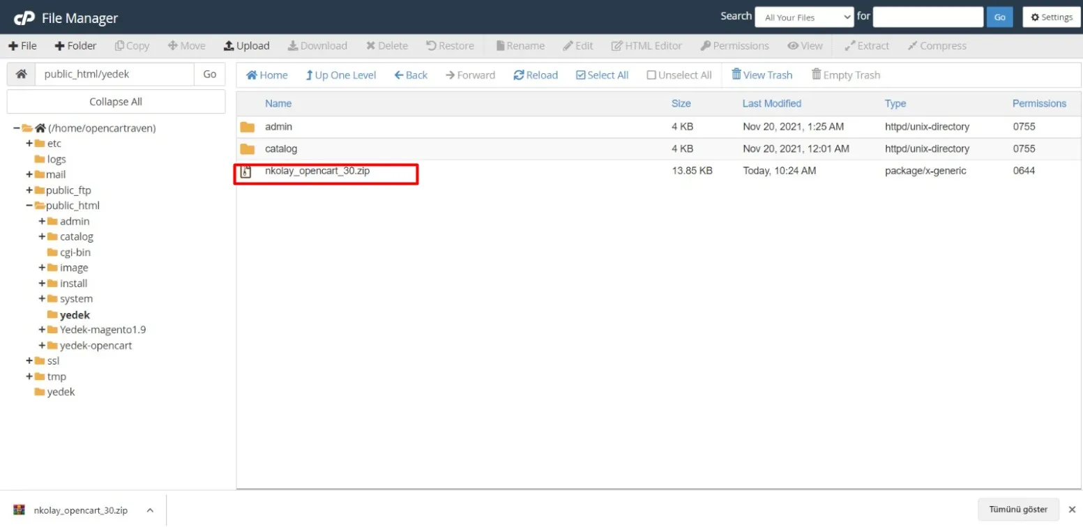 - Dosyaları unzip edin, yani açın. Amacımız buradaki admin ve catalog klasörlerini alıp OpenCart'ı kurduğumuz klasördeki admin ve catalog klasörleri ile birleştirmek yani merge etmektir. Bu işlemi FTP ile de yapabilirsiniz.
