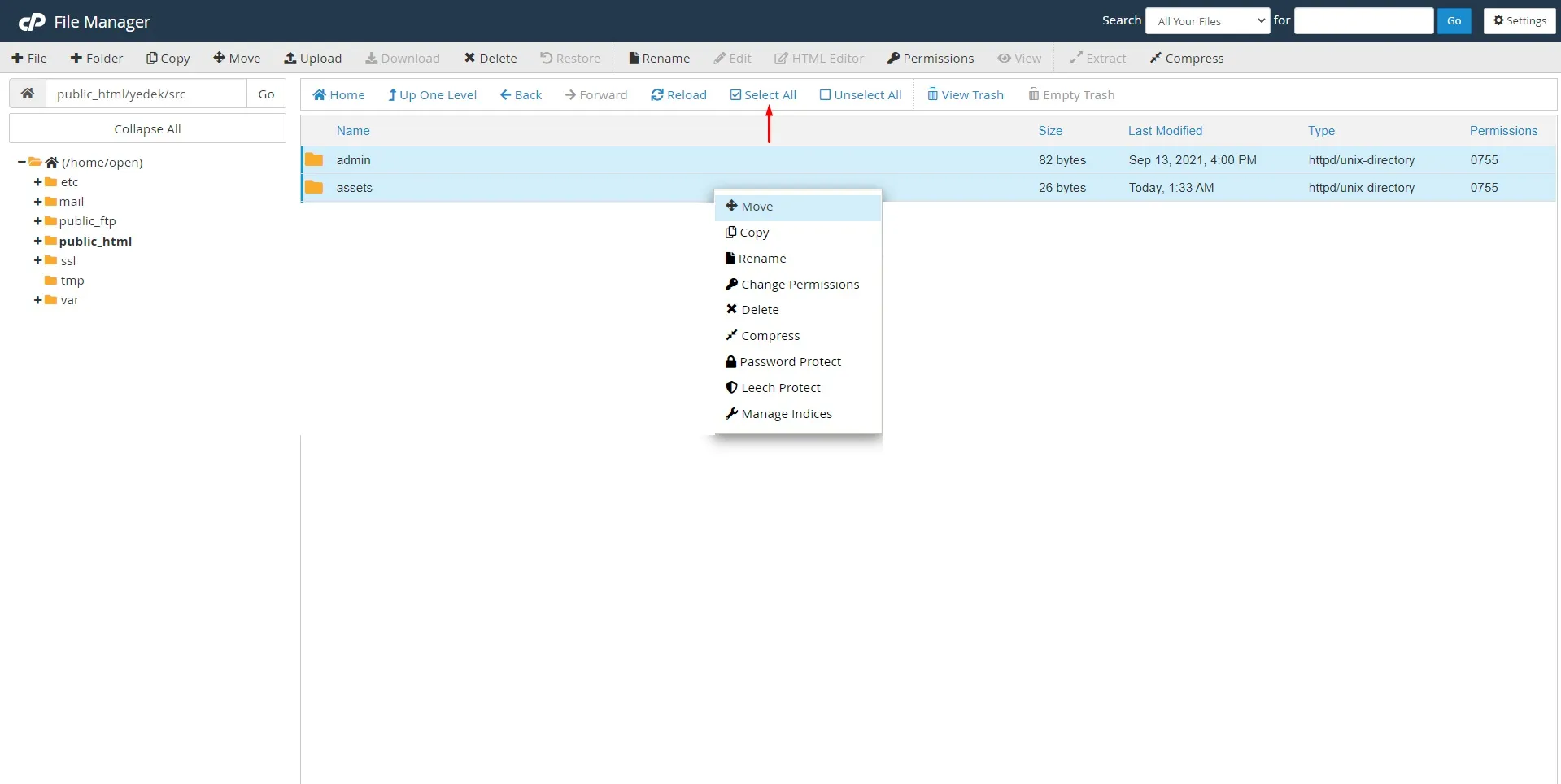 - Üst kısımda bulunan Select All butonuna tıklayıp dosyayı seçiniz. Seçilen dosyaların üzerine sağ tıklayıp Move'a tıklayınız.