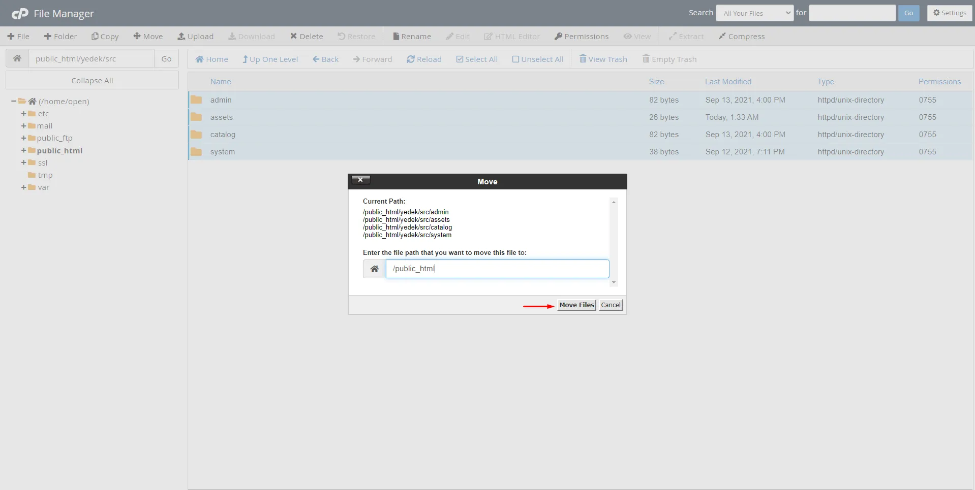 - Açılan pencerede adres satırı yerine OpenCart uygulamasını hangi dizine kurduysanız o dizinin adını yazın. Örneğin /public_html/OpenCart yazıp Move Files butonuna tıklayınız. Burada yaptığımız şey Pay N Kolay'dan indirdiğiniz modülün içindeki dosyaları OpenCart klasöründeki dosyalar ile birleştirmek ( merge etmektir ).