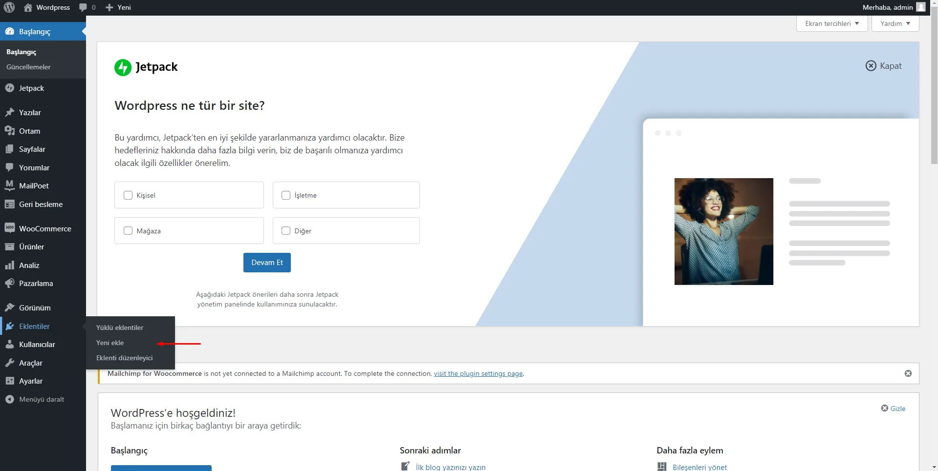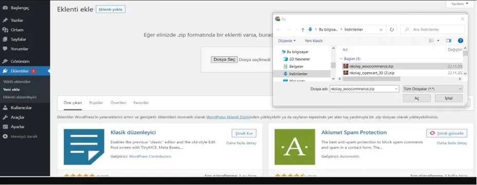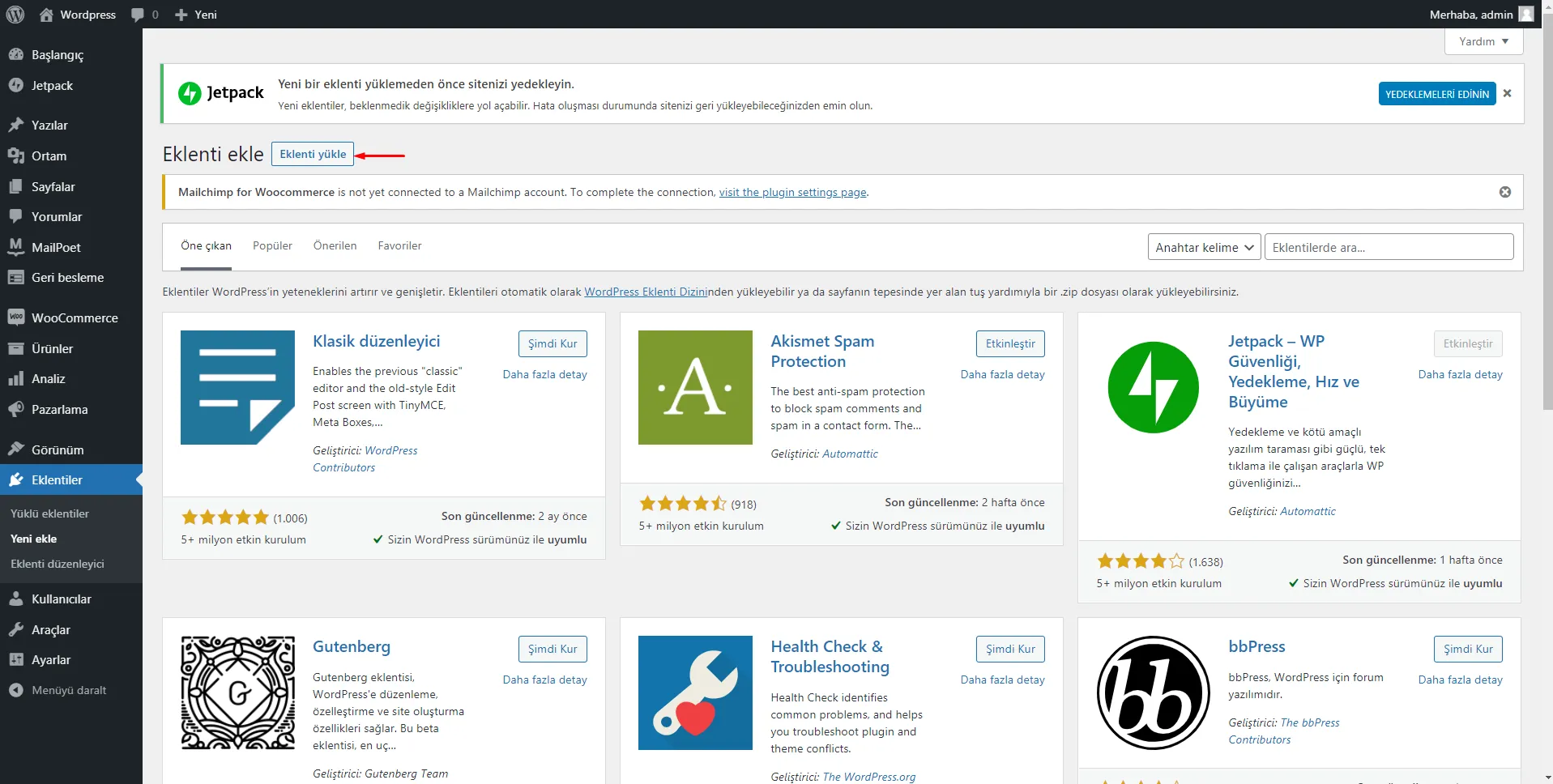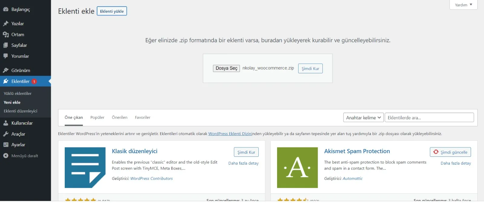 - Admin panelinden Eklentiler kısmından Yeni ekle butonuna tıklayınız.