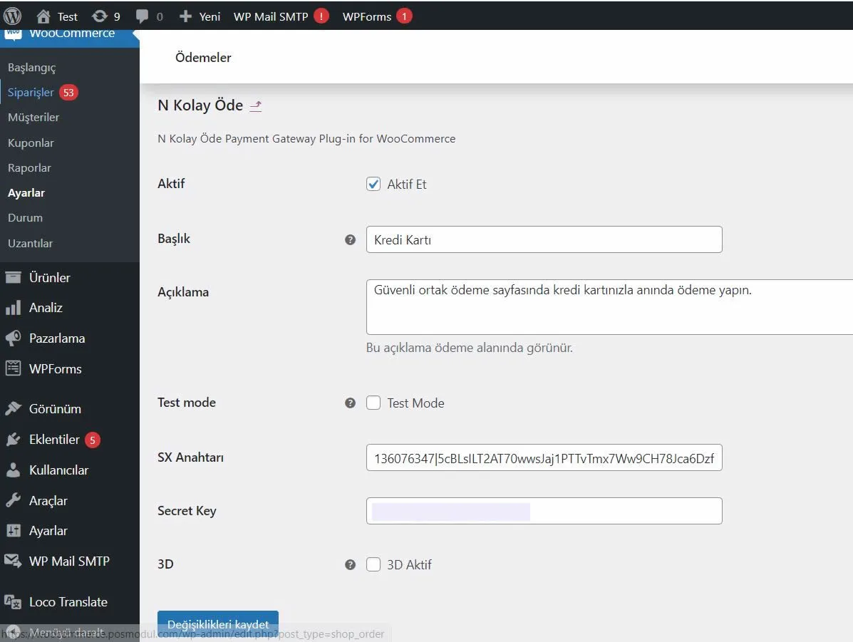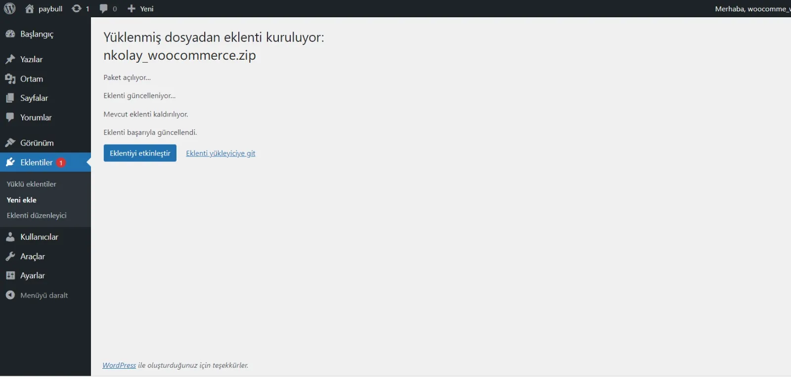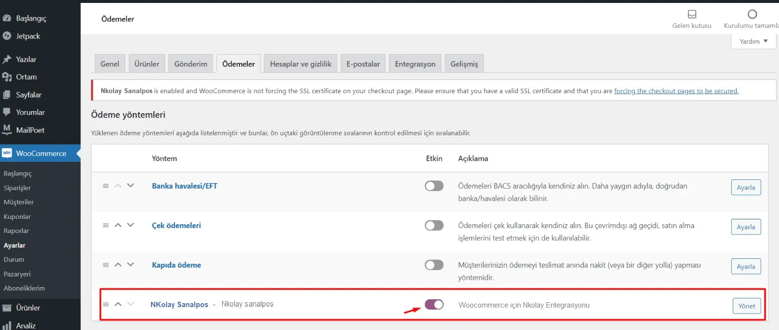 Önemli Bilgi: WooCommerce'de Pay N Kolay Sanal POS eklentisini kullanabilmek için önce diğer kredi kartı ile ödeme alma eklentilerini devre dışı bırakmanız ( etkisizleştirmeniz ) gerekmektedir. Aksi takdirde, Pay N Kolay Sanal POS modülü çalışmayabilir, birden fazla kredi kartı ile ödeme alma eklentisinin etkin olması web sitenizde hataya sebep olabilir.