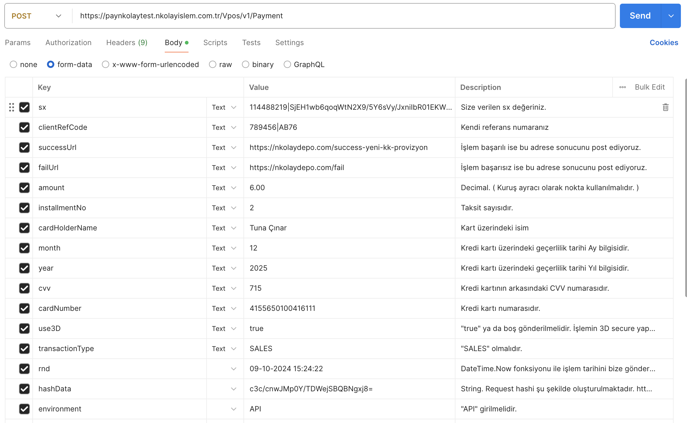 - Bu versiyonda tüm değişkenler "https://paynkolaytest.nkolayislem.com.tr/Vpos/v1/Payment" adresine Body'de form-data olarak POST edilir. ( sx, clientRefCode, successUrl, failUrl, amount, installmentNo, cardHolderName, month, year, cvv, cardNumber, use3D, transactionType, rnd, hashData, environment, currencyNumber )